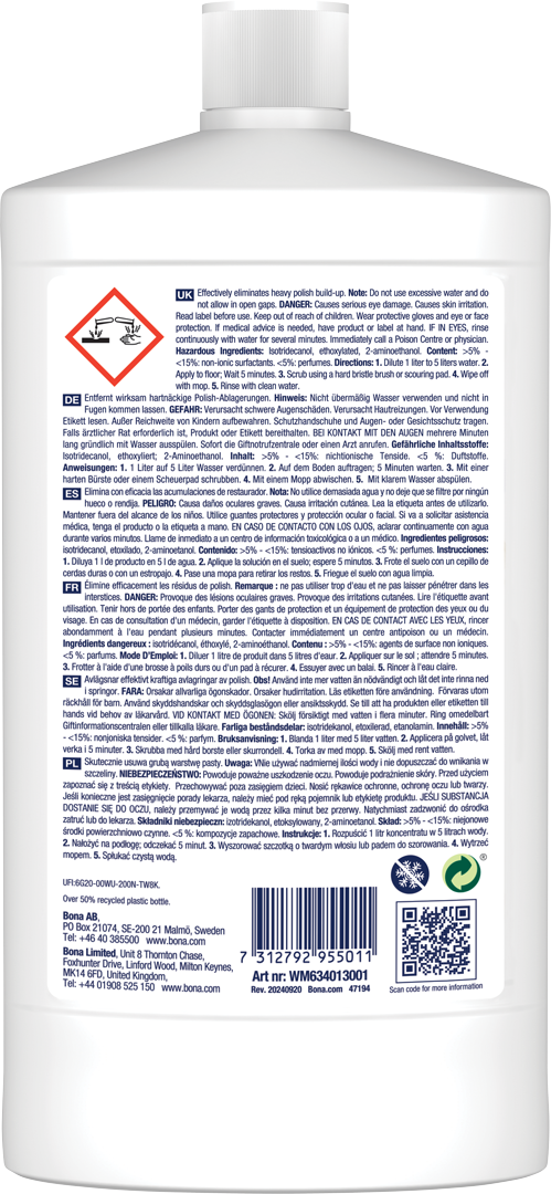 Bona Floor Polish Remover je posebej formuliran za odstranjevanje Bona Wood Floor Polish, Bona Floor Polish za trde površine in Bona Wood Floor Refresher. Hitro in učinkovito odstranjuje močne obloge. Pomembno! Bodite previdni pri nanašanju na tla z odprtimi režami, ki lahko, če so nasičene, povzročijo madeže.