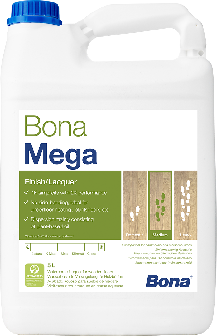 Bona Mega je kisik-križni poliuretanski premaz, idealen za težka domača in lahka komercialna območja, ki nudi odlično zaščito pred razlitji. Njegova inovativna formulacija se je izkazala kot popolnoma primerna za tla z visokim gibanjem, deske in talno gretje.