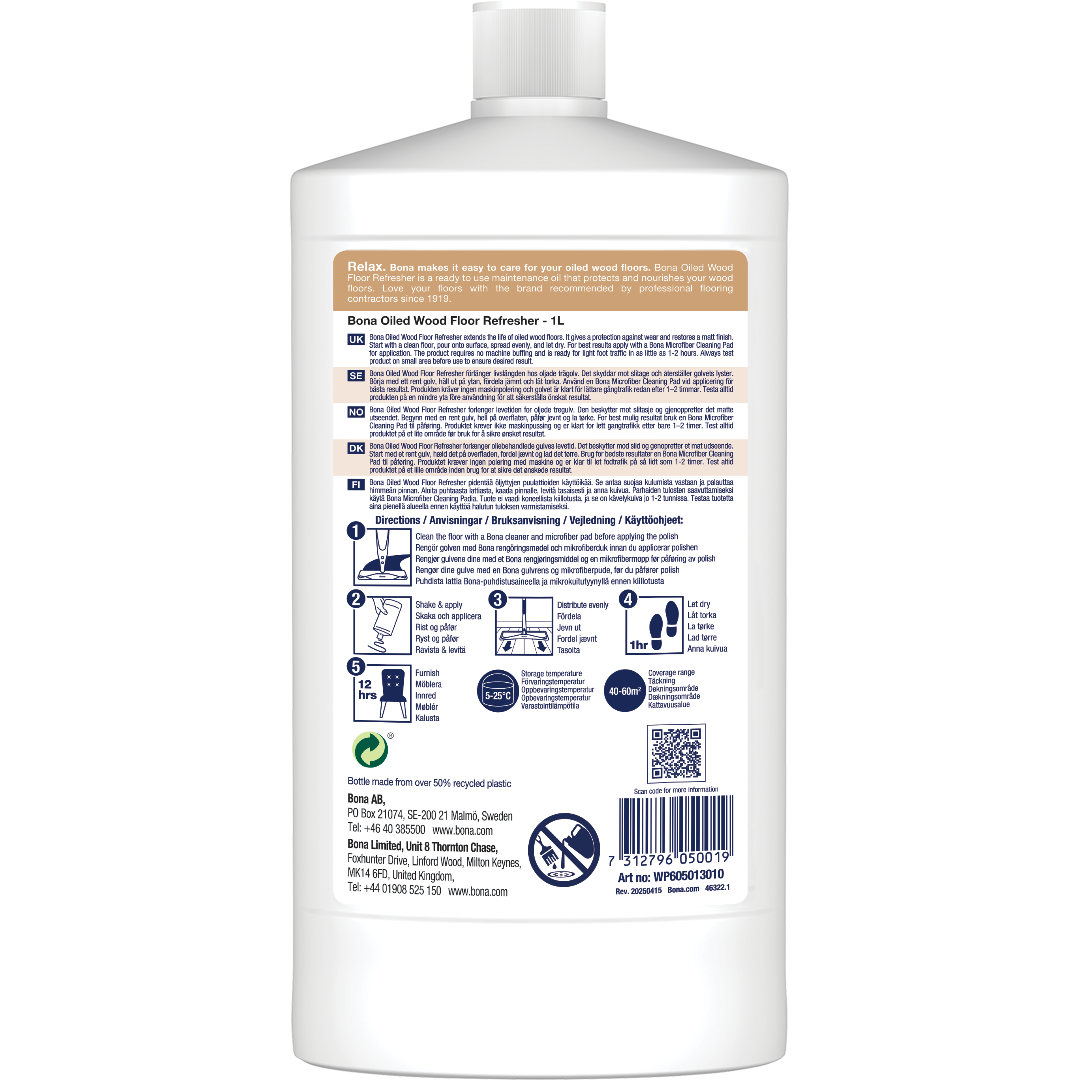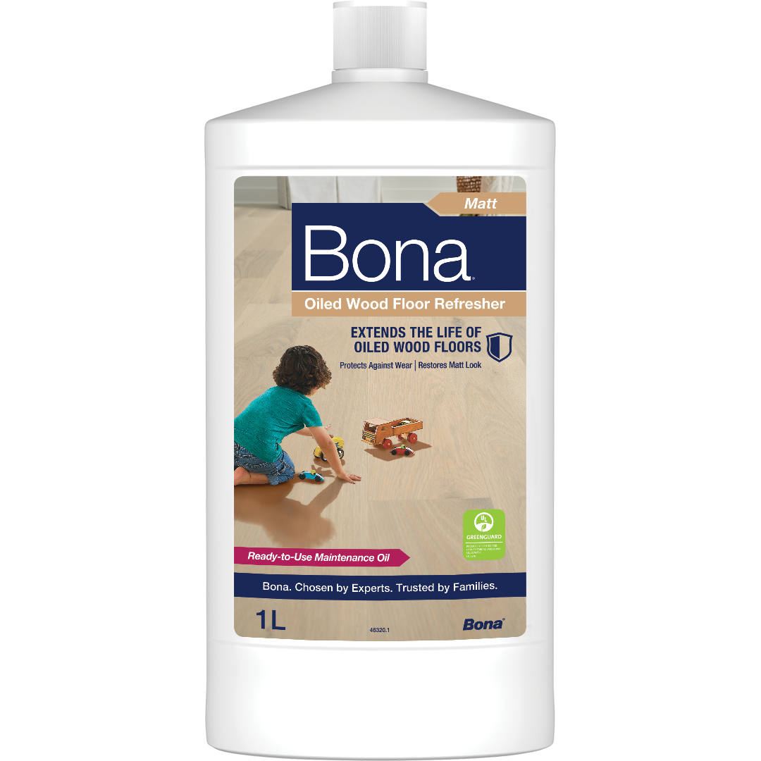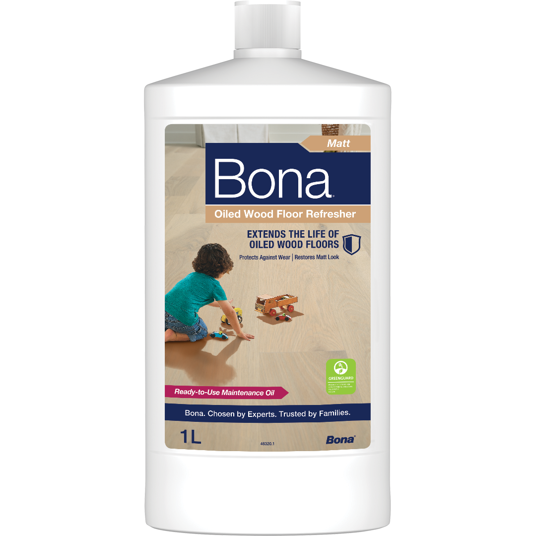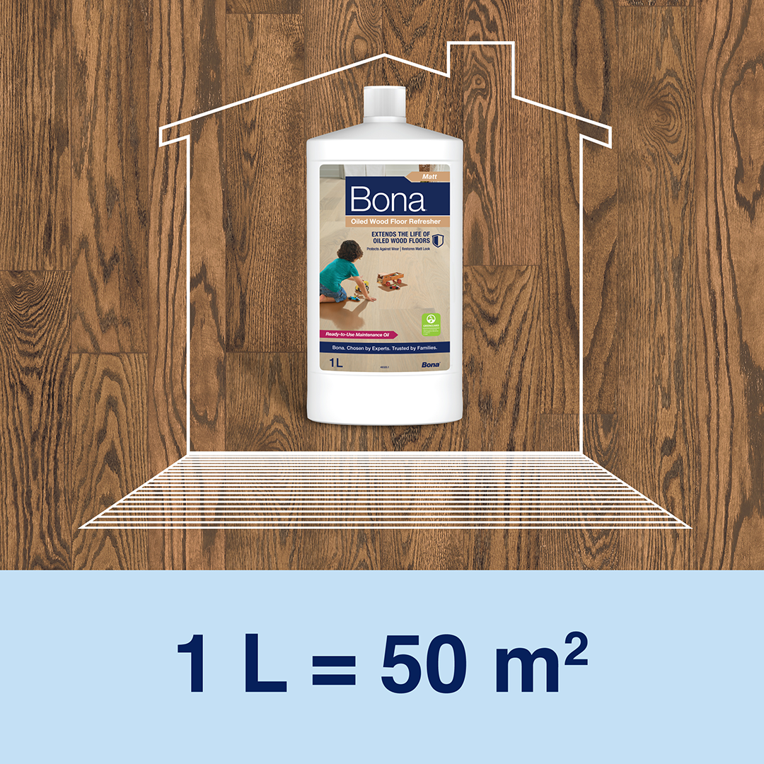 Bona Oljeno Wood Floor Refresher olajša vzdrževanje oljenih lesenih talnih oblog. Preprosto nalijte na površino, razporedite in pustite, da se posuši. Izdelek ne zahteva strojnega poliranja in tla so pripravljena za lahek peš promet že v 1-2 urah po nanosu.