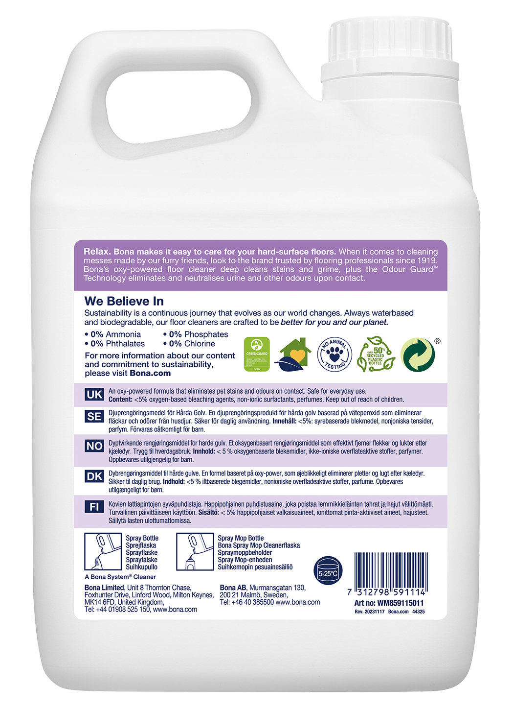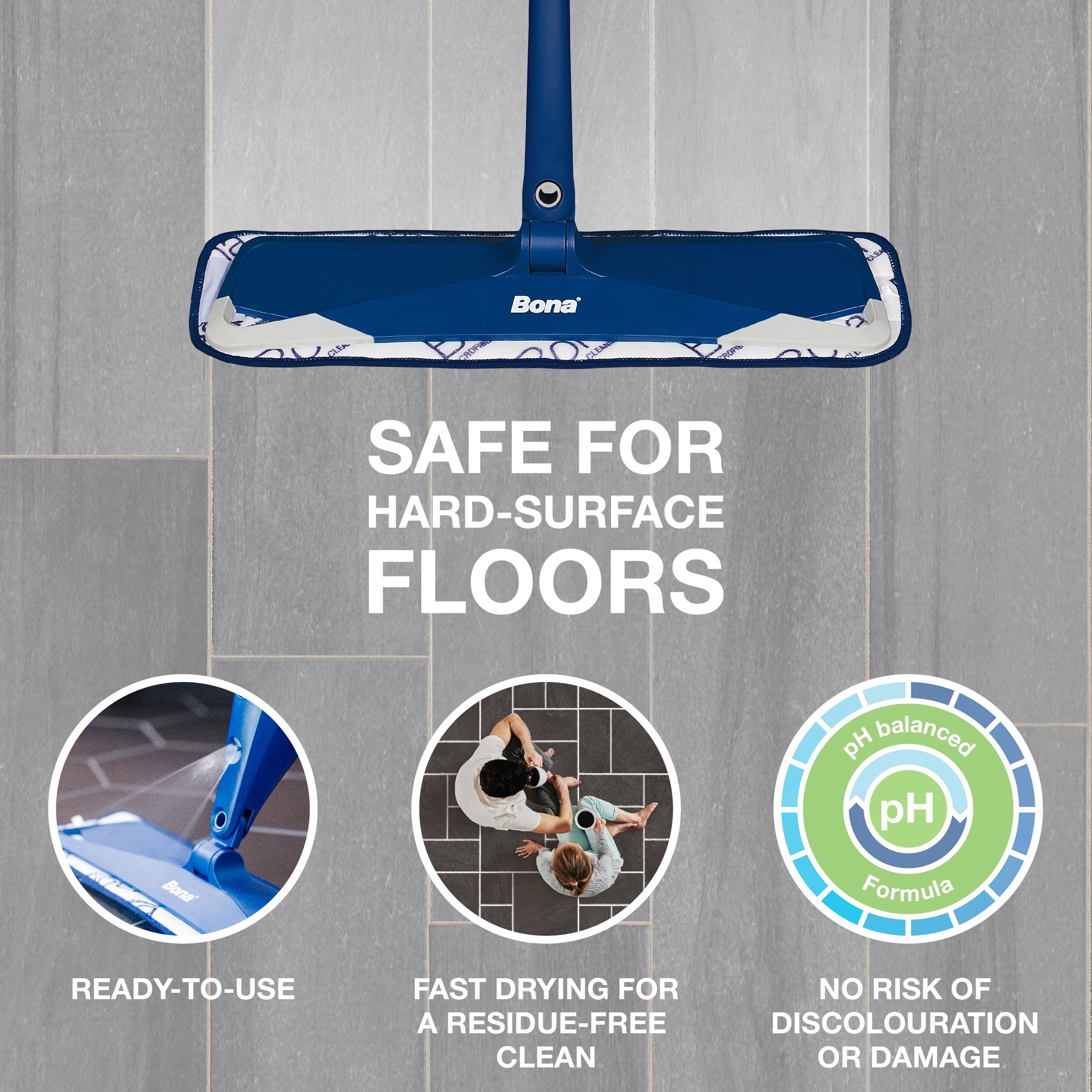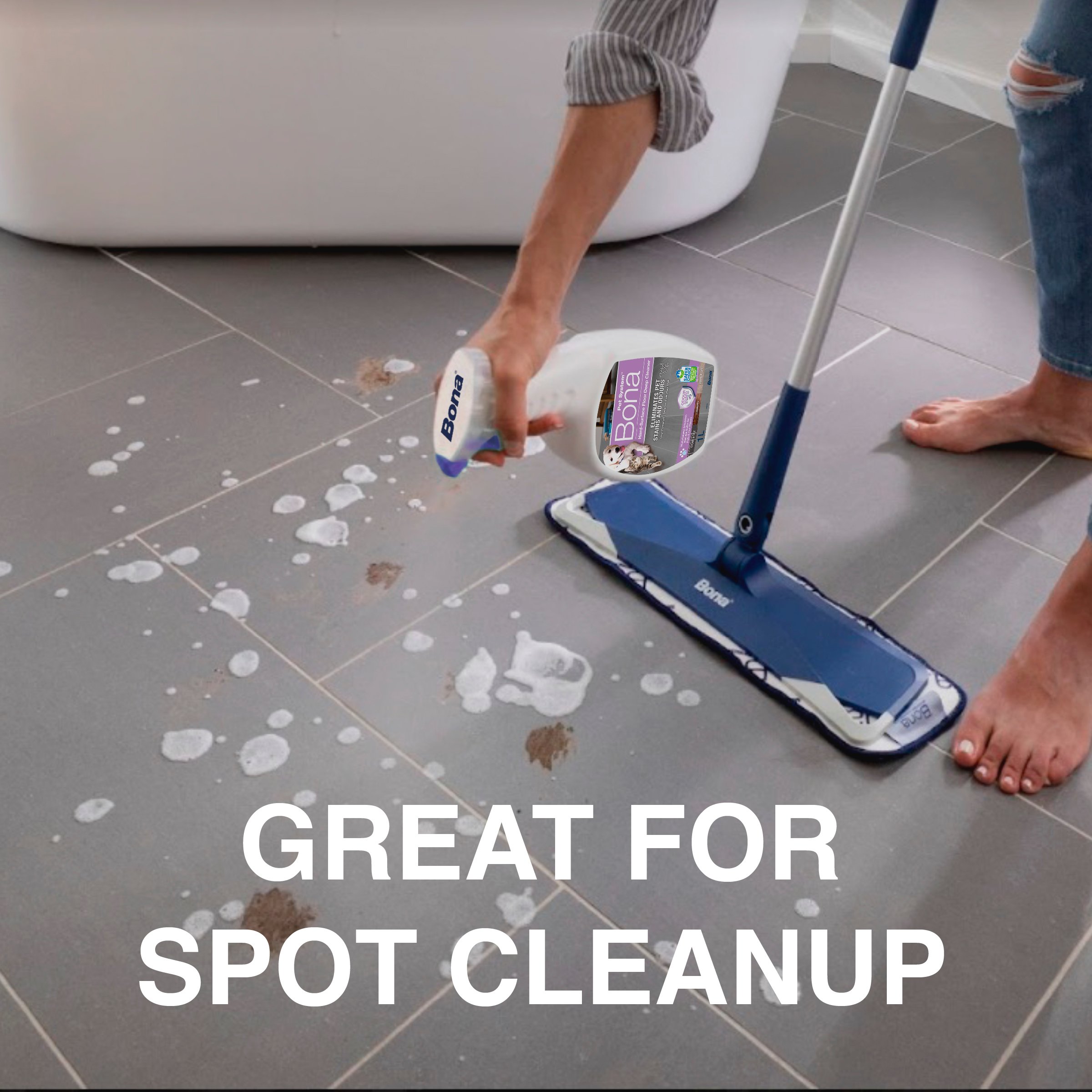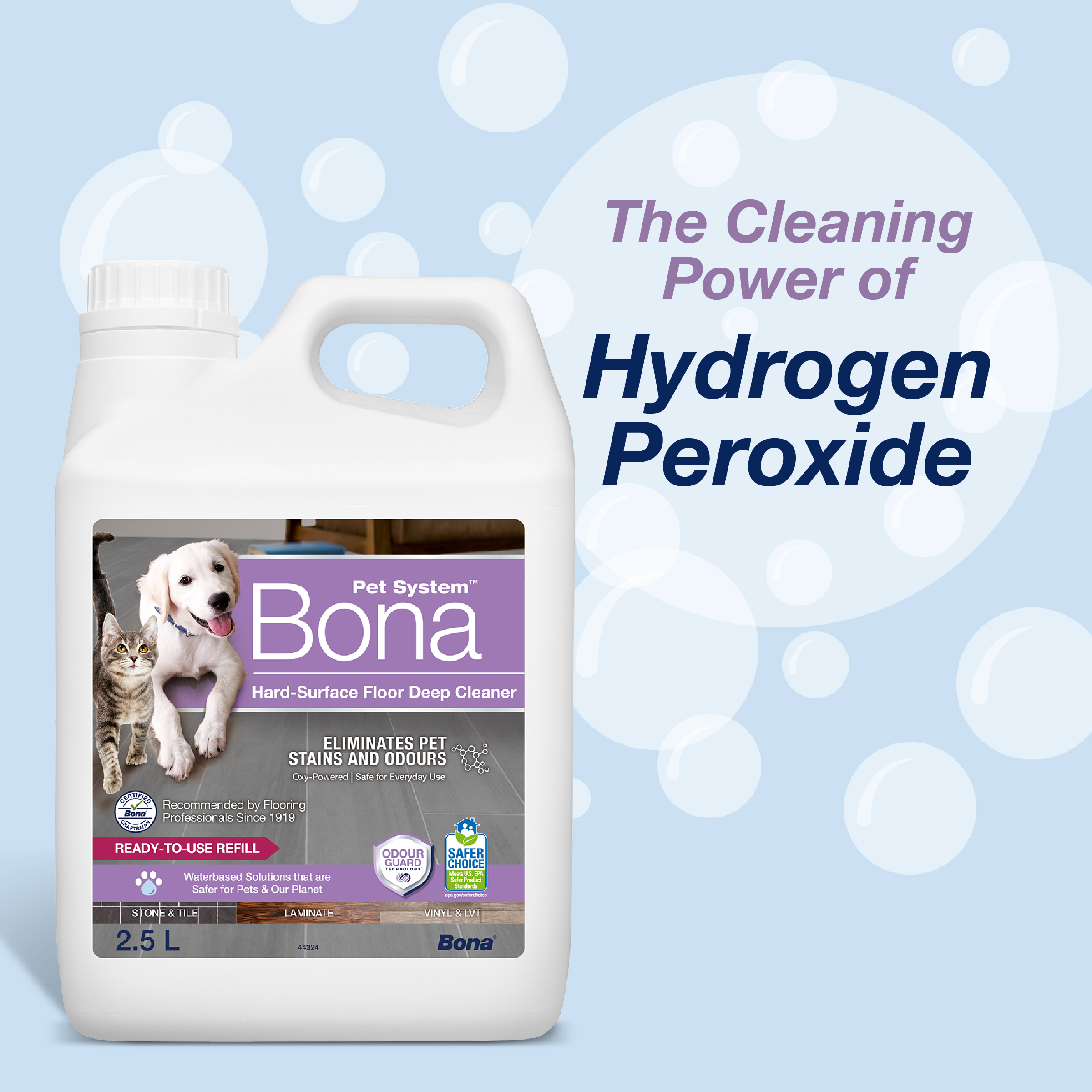 Sprostite se, Bona olajša skrb za vaše trde talne obloge. Ko gre za čiščenje nereda, ki ga povzročijo naši kosmati prijatelji, se obrnite na blagovno znamko, ki ji zaupajo strokovnjaki za talne obloge od leta 1919. Bonin čistilec tal z močjo kisika globinsko čisti in prodira skozi trdovratne madeže, vneseno umazanijo in nesrečne madeže z močjo čiščenja vodikovega peroksida. Tehnologija Odour Guard™ odpravlja in nevtralizira vonj urina in drugih organskih vonjav ob stiku.