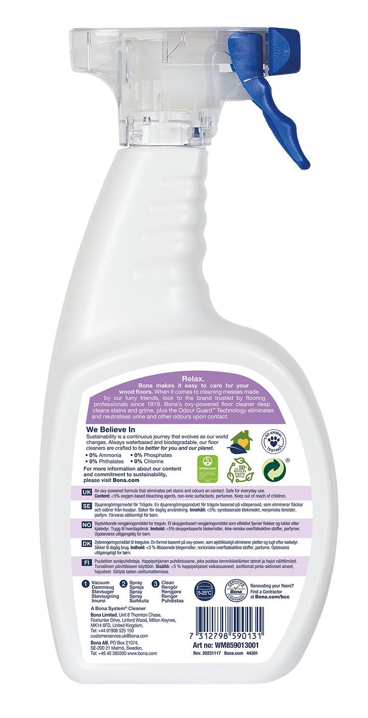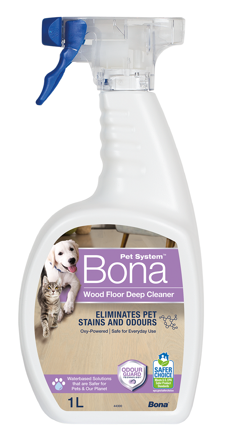 Sprostite se, Bona olajša nego vaših lesenih tal. Ko gre za čiščenje nereda, ki ga povzročijo naši kosmati prijatelji, se obrnite na blagovno znamko, ki ji zaupajo strokovnjaki za talne obloge že od leta 1919. Bona čistilo za tla z močjo kisika globinsko čisti in prodira skozi trdovratne madeže, vneseno umazanijo in nesreče z močjo čiščenja vodikovega peroksida. Tehnologija Odour Guard™ odpravlja in nevtralizira vonj urina in drugih organskih vonjav ob stiku.