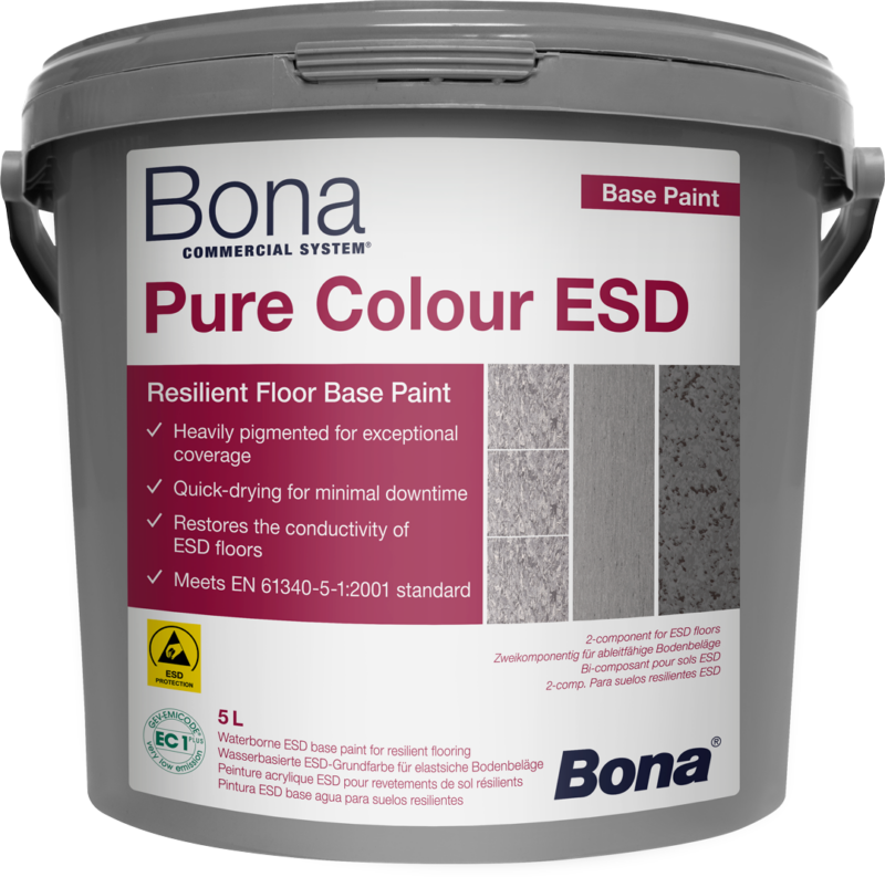 Bona Pure Colour ESD je vodna osnovna barva, ki je na voljo v treh vsestranskih barvah – Agate Grey, Pastel Turquoise in Pigeon Blue. Močno pigmentirana za izjemno pokrivnost in hitro sušenje za minimalni izpad. Namenjena je uporabi v sistemu skupaj z Bona Pure ESD Vibrant za doseganje/ohranjanje skladnosti z EN 61340, del 5-1, o elektrostatiki zaščiti. Tehnični podatki in varnostni listi so na voljo registriranim strankam na zahtevo. Tehnični podatki so na voljo registriranim strankam na zahtevo.