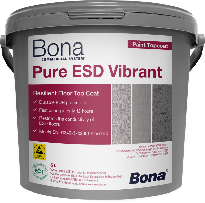 Vodna prevodna zgornja plast za obnovo elektrostatik-difuznih (ESD) talnih oblog. Zasnovana za uporabo v sistemu skupaj z Bona Pure Colour ESD za doseganje/ohranjanje skladnosti z EN 61340, del 5-1, o elektrostatik zaščiti.