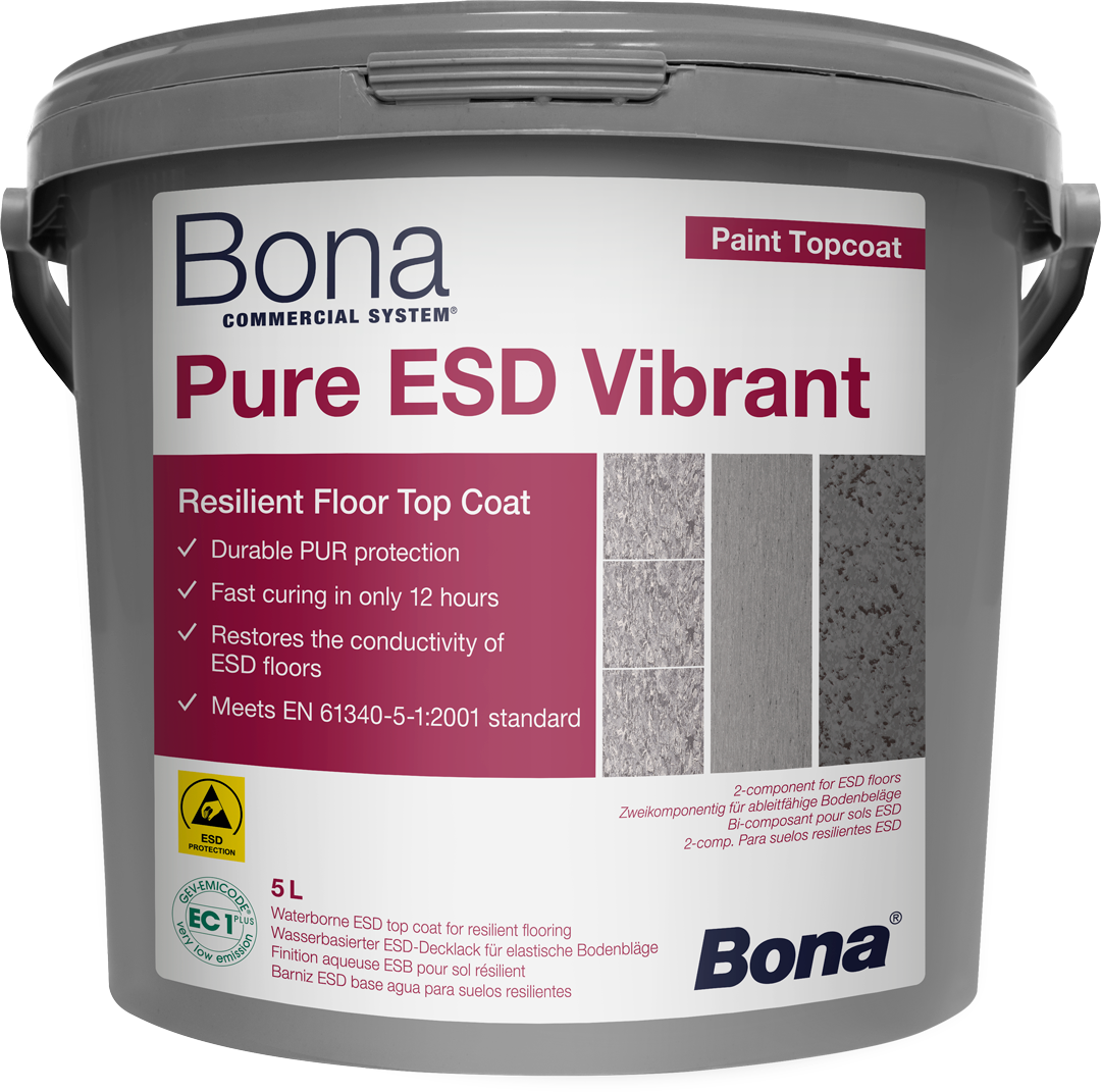 Bona Pure ESD Vibrant je vzdržljiva zgornja plast, ki lahko razprši statično elektriko in jo prenese na tla. Za tiste situacije, ko želite preoblikovati dizajn ESD odpornih tal, je Bona Pure ESD Vibrant zgornja plast, ki jo uporabite. Uporablja se v povezavi z Bona Pure Colour ESD osnovno barvo, Bona Pure Vibrant je vzdržljiva z visoko odpornostjo na kemikalije in običajna razkužila. Ima hitro strjevanje v 12 urah in je skladna z evropskimi ESD standardi. Tehnični podatkovni list je na voljo registriranim strankam na zahtevo.