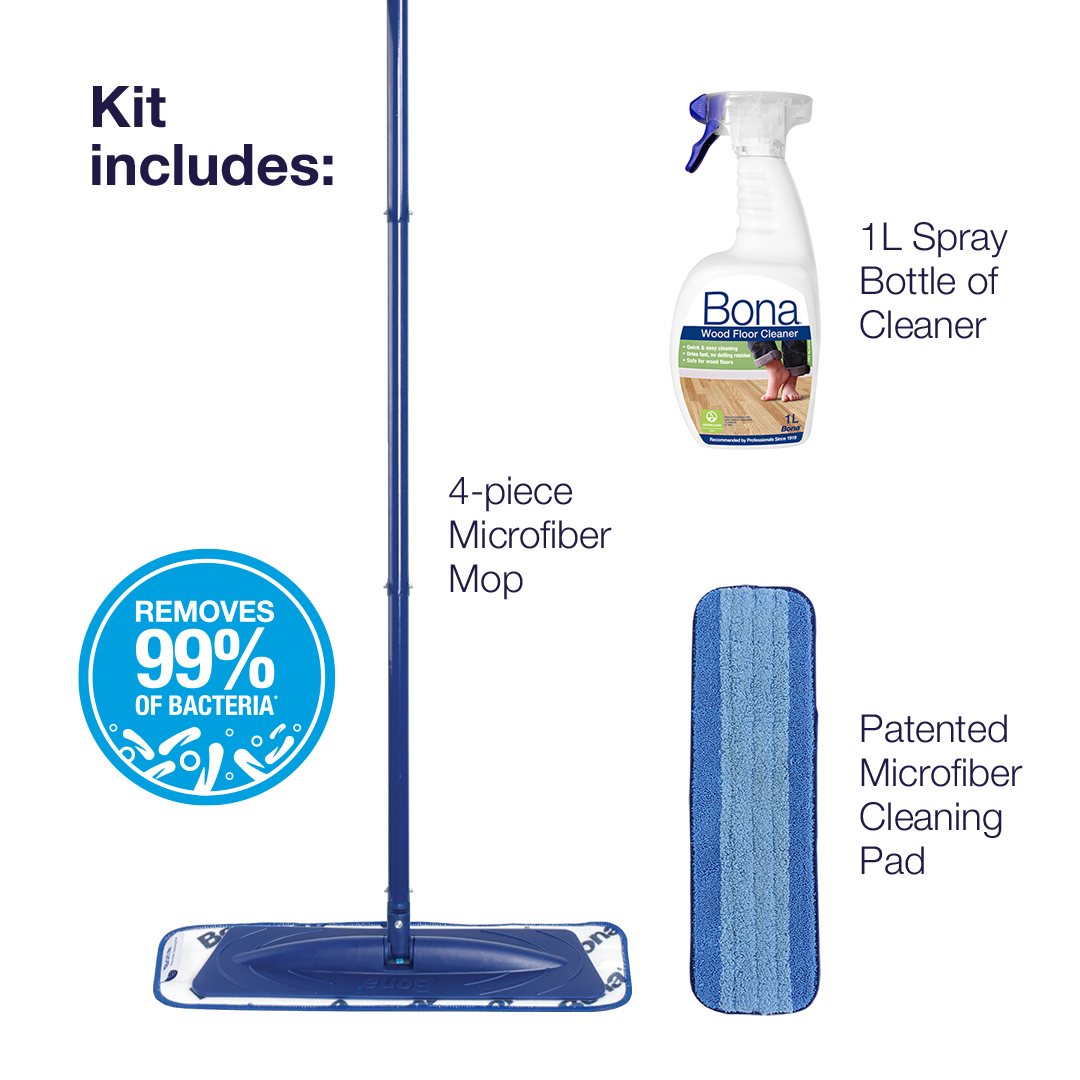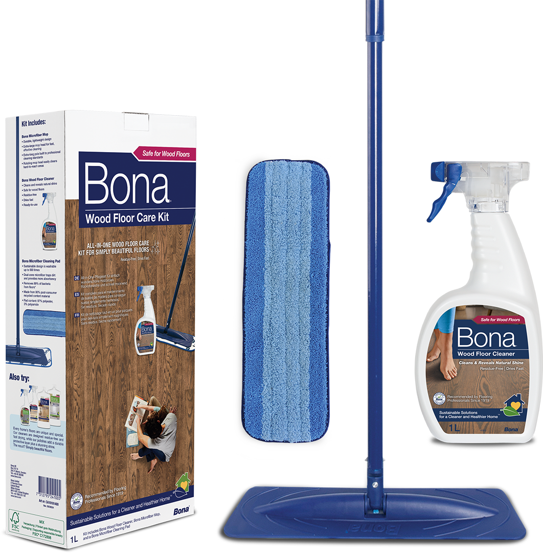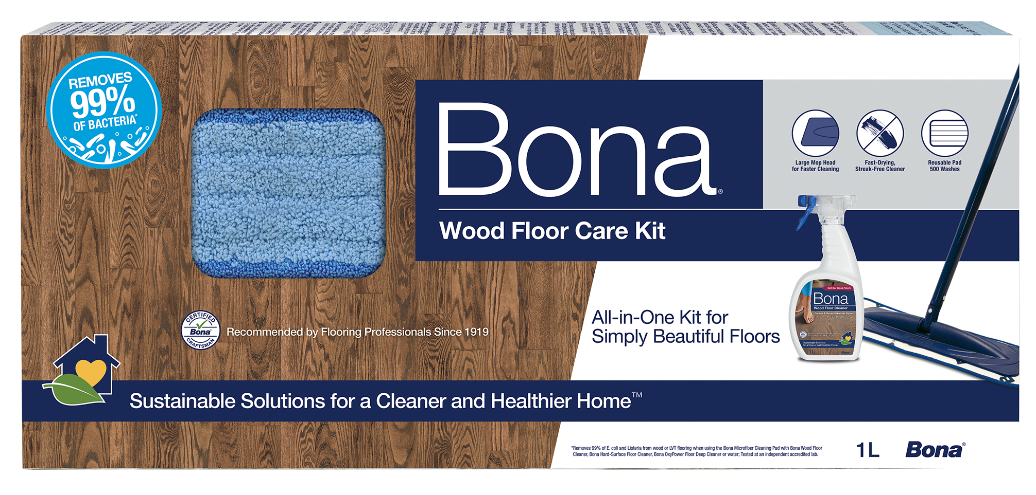 Polagalci talnih oblog se strinjajo, da pri iskanju najboljše nege za lesena tla lahko zaupate sistemu izdelkov za nego tal Bona. Sistem za nego lesenih tal Bona (Bona Wood Floor Care System) vključuje vrhunski mop s krpo iz mikrovlaken, čistilno krpo iz mikrovlaken Bona in čistilo za lesena tla Bona. Z drugimi besedami, vsebuje vse, kar potrebujete za varno in enostavno čiščenje vaših lesenih tal. Hitro sušeča pH-nevtralna raztopina, ki ne pušča ostankov, očisti lesena tla tako, da nežno in učinkovito odstrani prah, umazanijo in madeže ter razkrije naraven sijaj in lepoto tal. Rešitve na vodni osnovi in certifikat GREENGUARD GOLD zagotavljajo varen izdelek za vaš dom.