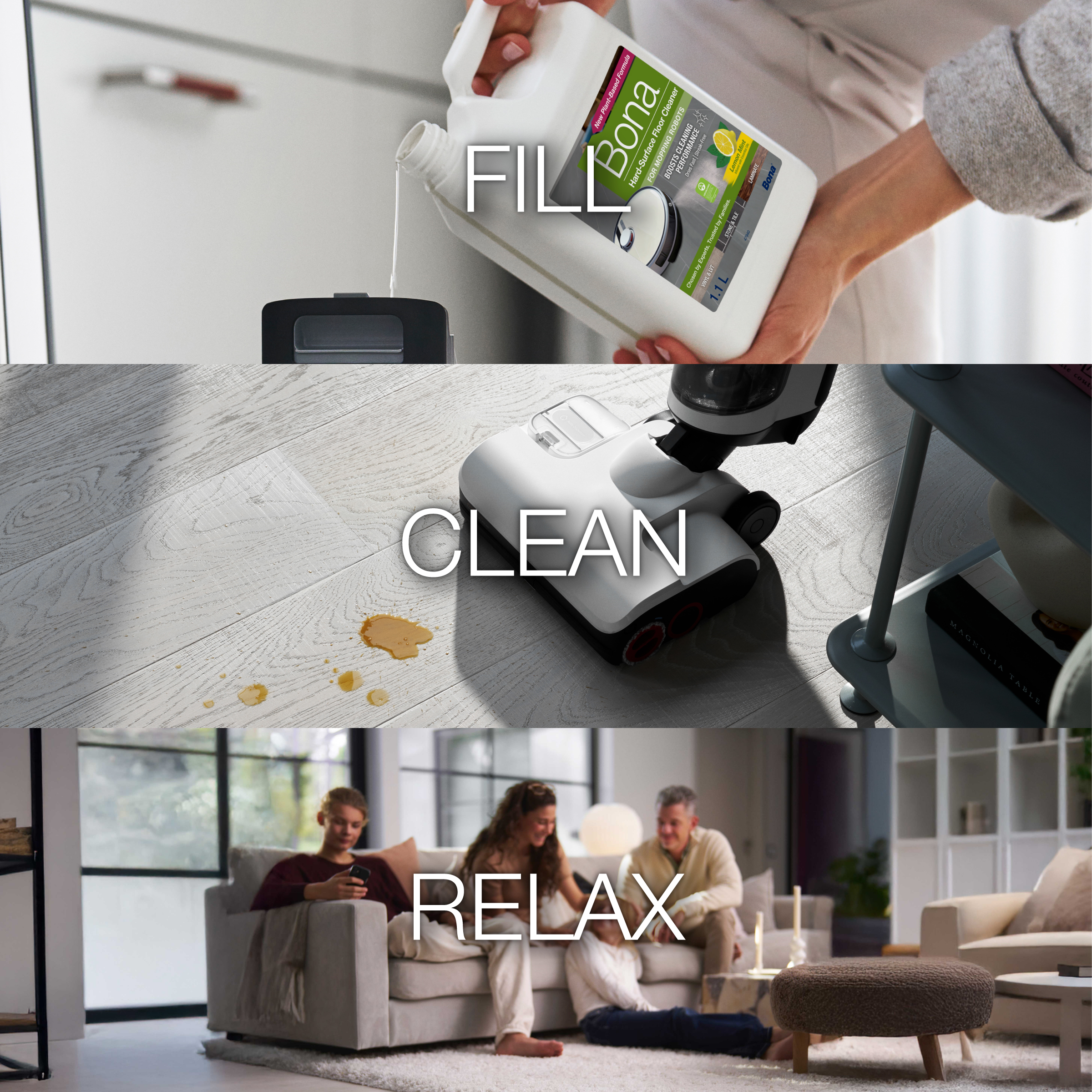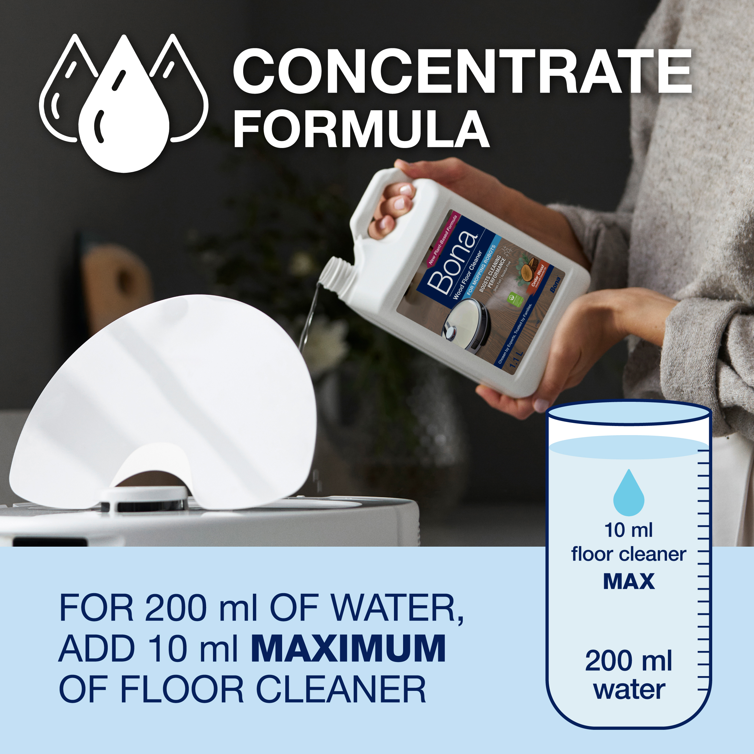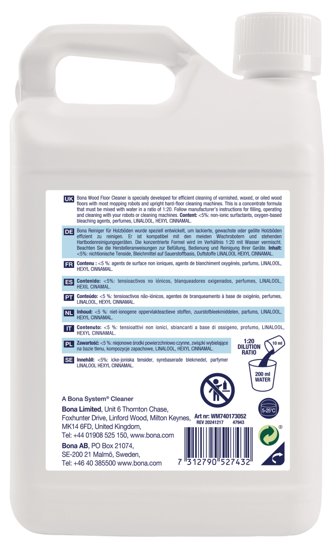 Talni izvajalci se strinjajo, ko iščete najboljše za nego lesenih tal, uporabite Bona. Bona Wood Floor Cleaner je zdaj na voljo v posebej formulirani raztopini, zasnovani za uporabo z večino robotov za mokro čiščenje trdih tal in pokončnih sesalnikov za mokro čiščenje, da izboljšate učinkovitost čiščenja. Ta edinstvena koncentrirana formula z bio-osnovanimi sestavinami je posebej razvita za učinkovito čiščenje lakiranih, voskanih ali oljenih lesenih tal, da poudari naravni sijaj in lepoto vaših tal. Posebej je zasnovana za varno odstranjevanje prahu, umazanije in umazanije z lesenih tal, lahki vonj cedrovine pa prinaša svež, čist občutek v vaš dom. Vodna, pH uravnotežena formula se hitro suši in ne pušča ostankov. Prav tako ima certifikat GREENGUARD GOLD, ki podpira boljšo kakovost zraka v zaprtih prostorih.