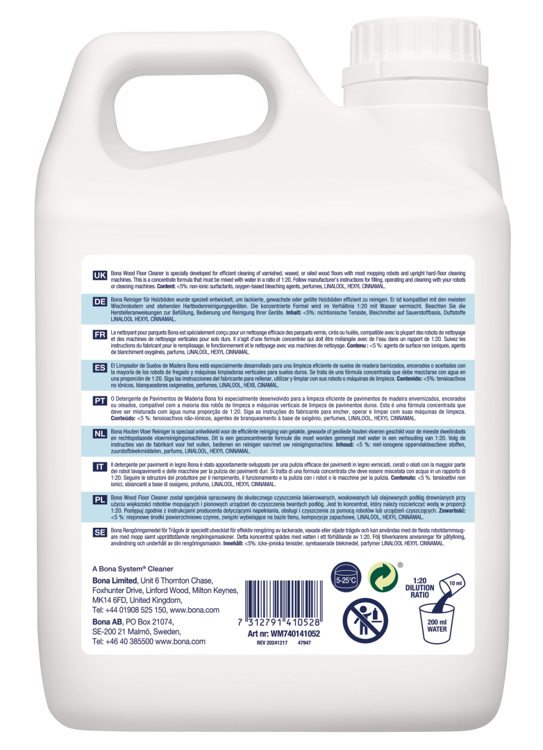 Talni izvajalci se strinjajo, ko iščete najboljše za nego lesenih tal, uporabite Bona. Bona Wood Floor Cleaner je zdaj na voljo v posebej formulirani raztopini, zasnovani za uporabo z večino robotskih čistilcev za trda tla in pokončnih sesalnikov za povečanje učinkovitosti čiščenja. Ta edinstvena koncentrirana formula z bio-osnovanimi sestavinami je posebej razvita za učinkovito čiščenje lakiranih, voskanih ali oljenih lesenih tal, da poudari naravni sijaj in lepoto vaših tal. Posebej je zasnovana za varno odstranjevanje prahu, umazanije in nečistoč z lesenih tal, lahkoten vonj cedrovine pa prinaša svež, čist občutek v vaš dom. Vodna, pH uravnotežena formula se hitro suši in ne pušča ostankov. Prav tako ima certifikat GREENGUARD GOLD, ki podpira boljšo kakovost zraka v zaprtih prostorih.