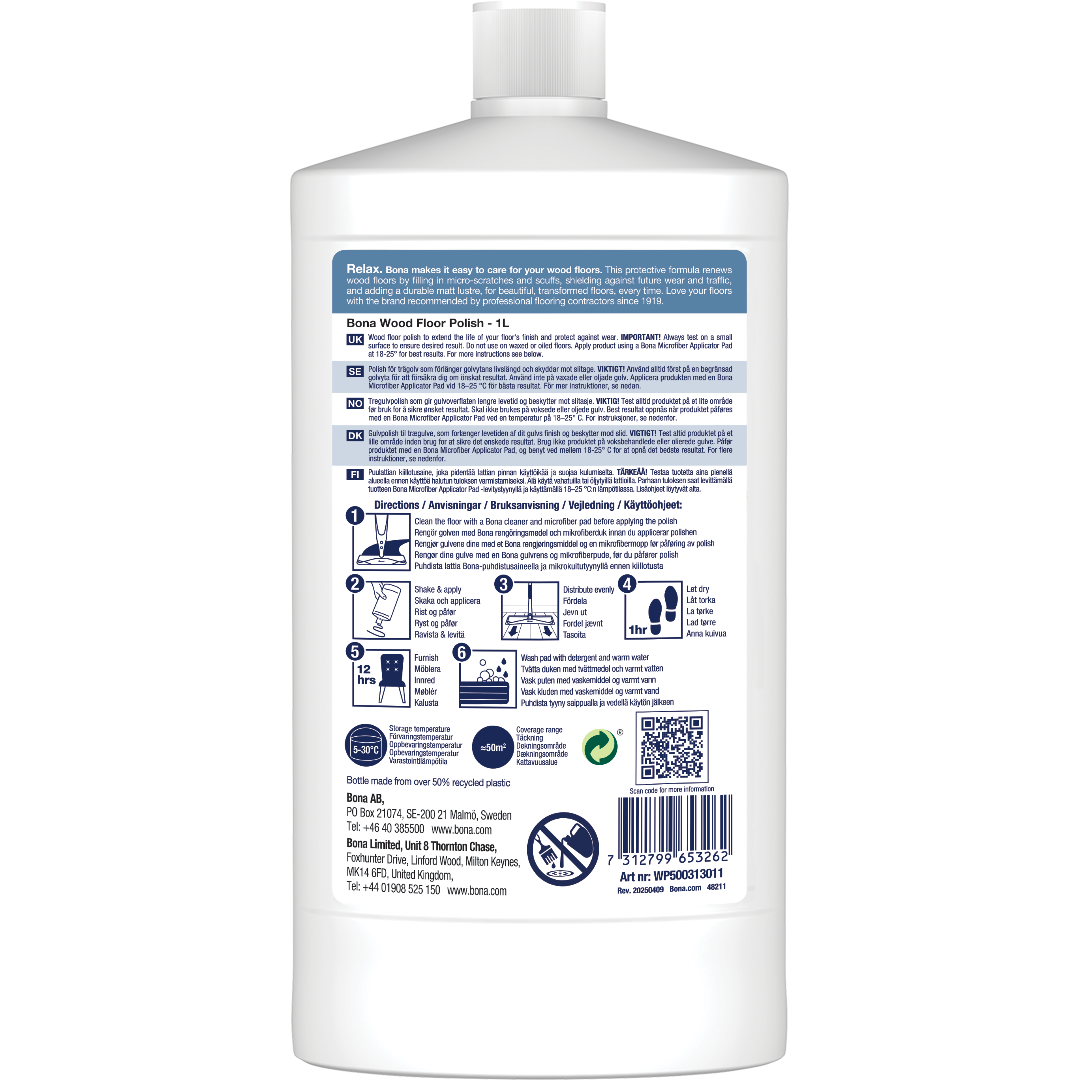 Bona Wood Floor Polish Mat obnovi naravni sijaj vaših lesenih tal, hkrati pa nudi zaščito pred obrabo. Trpežna mešanica uretanskega akrila doda zaščitni sloj in zapolni mikro praske, kar izboljša videz vaših tal. Uporabljajte vsakih 1-4 mesece, odvisno od prometa, da ohranite tla revitalizirana in kot nova. Pomembno! Pred uporabo vedno testirajte tla za oprijem in želene rezultate. Varno za vsa nevoskana, poliuretansko obdelana lesena tla. Ne uporabljajte na voskanih ali oljenih tleh.