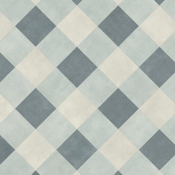 Bele in modre ploščice delujejo skupaj, da ustvarijo talno oblogo, ki je moderna in prefinjena.
